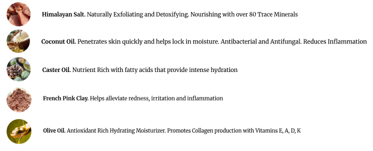 Ingredients: Coconut oil, pink Himalayan salt, distilled water, olive oil, sodium hydroxide, castor oil, French pink clay, 100% essential oils, (no artificial fragrances).
