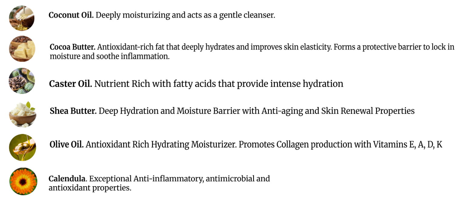 Ingredients: Calendula infused olive oil, distilled water, coconut oil, shea butter, sodium hydroxide, cocoa butter, castor oil, calendula petals, essential oils, (no artificial fragrances).